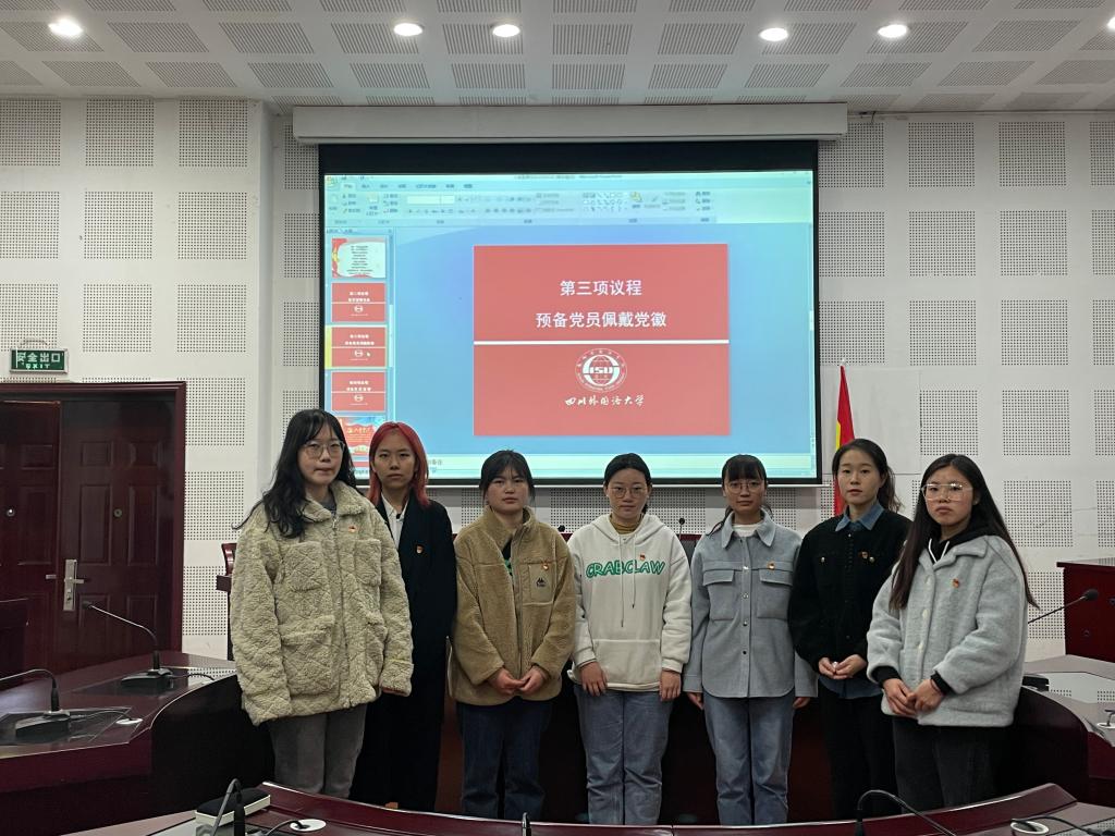 在响亮、庄严、激昂的国际歌声中,国际关系学院入党宣誓大会正式拉开帷幕。主持人包淑萍宣读了参加本次宣誓的预备党员名单,他们是冯晓韬、华淇淇、张雪雪、冉玲玲、谢文君、刘海飞、殷藕洁等7名同学,7名预备党员在现场佩戴上了党徽。