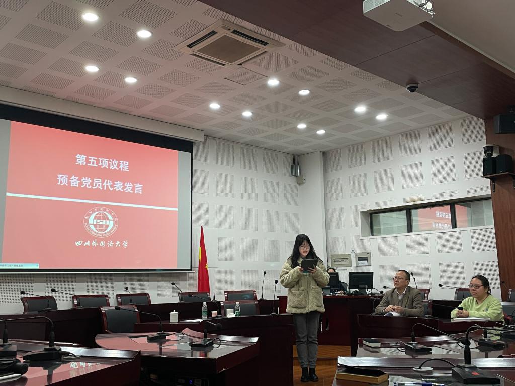 接着,学生党支部书记石巧品老师带领预备党员进行了入党宣誓。学院2020级学生殷藕洁作为预备党员代表上台发言,殷藕洁同学在发言中郑重承诺。一是不断提升自己的思想政治修养。二是不断提高自己为人民服务的本领和能力。三是树立起终身学习的观念。殷藕洁同学表示作为学生党员,将会肩负起党和人民赋予的重任与期望,严格要求自己,为社会主义建设贡献力量和智慧!