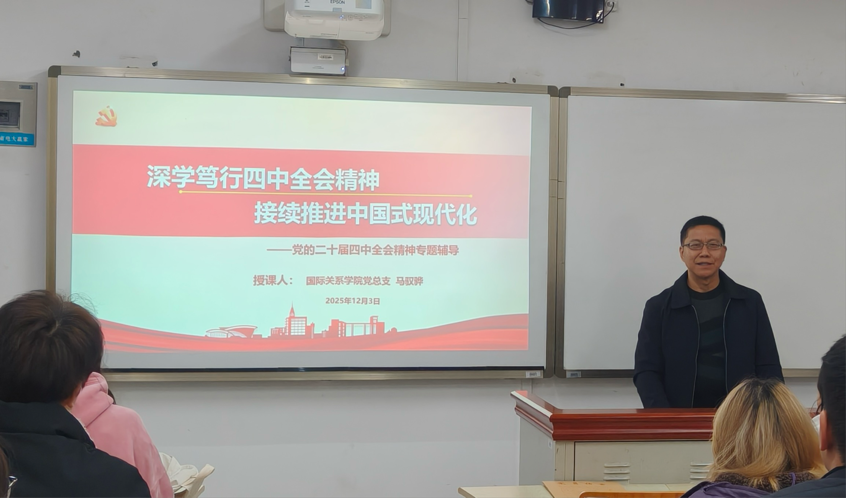 为深入学习贯彻党的二十届四中全会精神,勇担时代使命。2025年12月3日,国际关系学院在歌乐楼举办学习贯彻党的二十届四中全会精神专题党课,主题为“深学笃行党的二十届四中全会精神,接续推进中国式现代化”。学院党总支书记马驭骅担任主讲人,学院入党积极分子与党员发展对象共计30余人参与了本次学习。