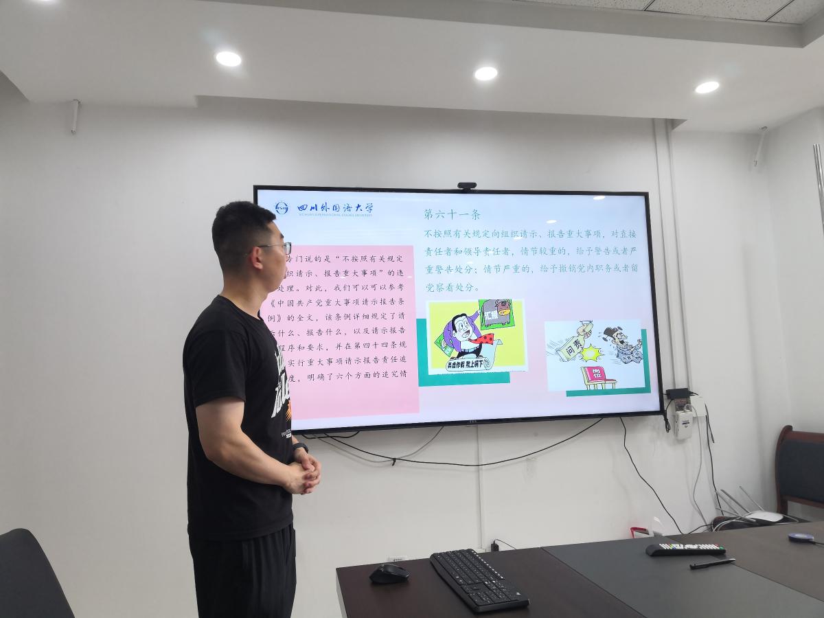 接下来,包淑萍对《中国共产党纪律处分条例》(以下简称《条例》)的总则做了专题解读和深入剖析。她从《条例》制订的背景、意义、适用范围和对象讲到了《条例》基本原则、要求、党员处分的种类和适用类型等,还给大家展示了高校和党政机关违反党纪的案例。讲解过程中能将理论结合实际,使同学们对条例有了更加深入的了解。