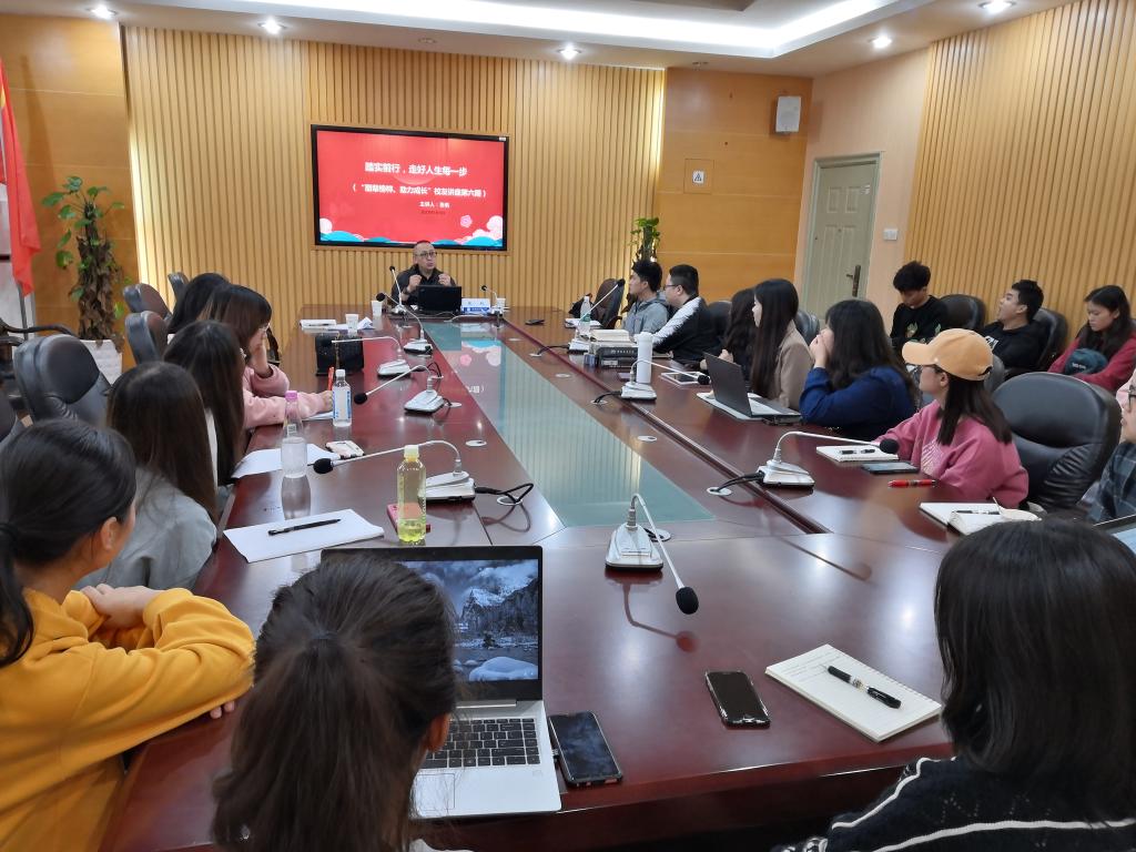 首先张帆校友为同学们分享了自己勤奋上进的求学之路和曲折丰富的职场经历。他从进入川外开始军训起,就明确了自己的目标,毛遂自荐成为班长,在随后的学习过程中积极进取,不仅在专业学习中成绩优异,同时踊跃参与学生会工作,担任学生会主席等。毕业后从事导游、销售等工作,也曾到基层单位挂职锻炼。2004年入职四川国际招标有限责任公司,从一个月薪只有1000的部门经理做起,一步一个脚印,踏踏实实做人,兢兢业业做事,现如今成为该企业的总经理。张帆校友用亲身经历告诉同学们,无论在学校还是职场,都要拥有一个强大的内心,都需要积极、主动、担当,以正向、正念、正能量面对遇到的困难与挫折。