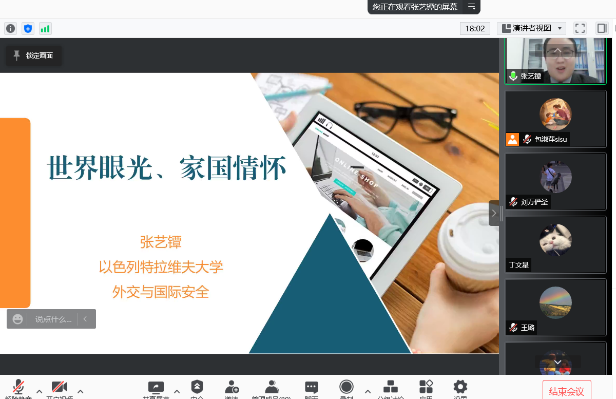 2021年12月6日晚上7:30,国际关系学院“朋辈榜样、助力成长”第九期推出了“世界眼光与家国情怀”为主题的线上分享交流会。本次分享会主讲人是国际关系学院2017届校友、以色列华商会副会长张艺镡。学院的包淑萍老师做主持,共计100余名同学参加了此次活动。