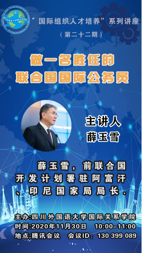 2020年11月30日上午10点,我院在腾讯会议平台举行了“国际组织人才培养”系列讲座第22期,特邀请了前联合国开发计划署驻阿富汗、印尼国家局局长薛玉雪为学生们讲授如何“做一名胜任的联合国国际公务员”。该场讲座由刘玉梅院长主持,包括2020级国际组织人才实验班学生共计40余人参会。