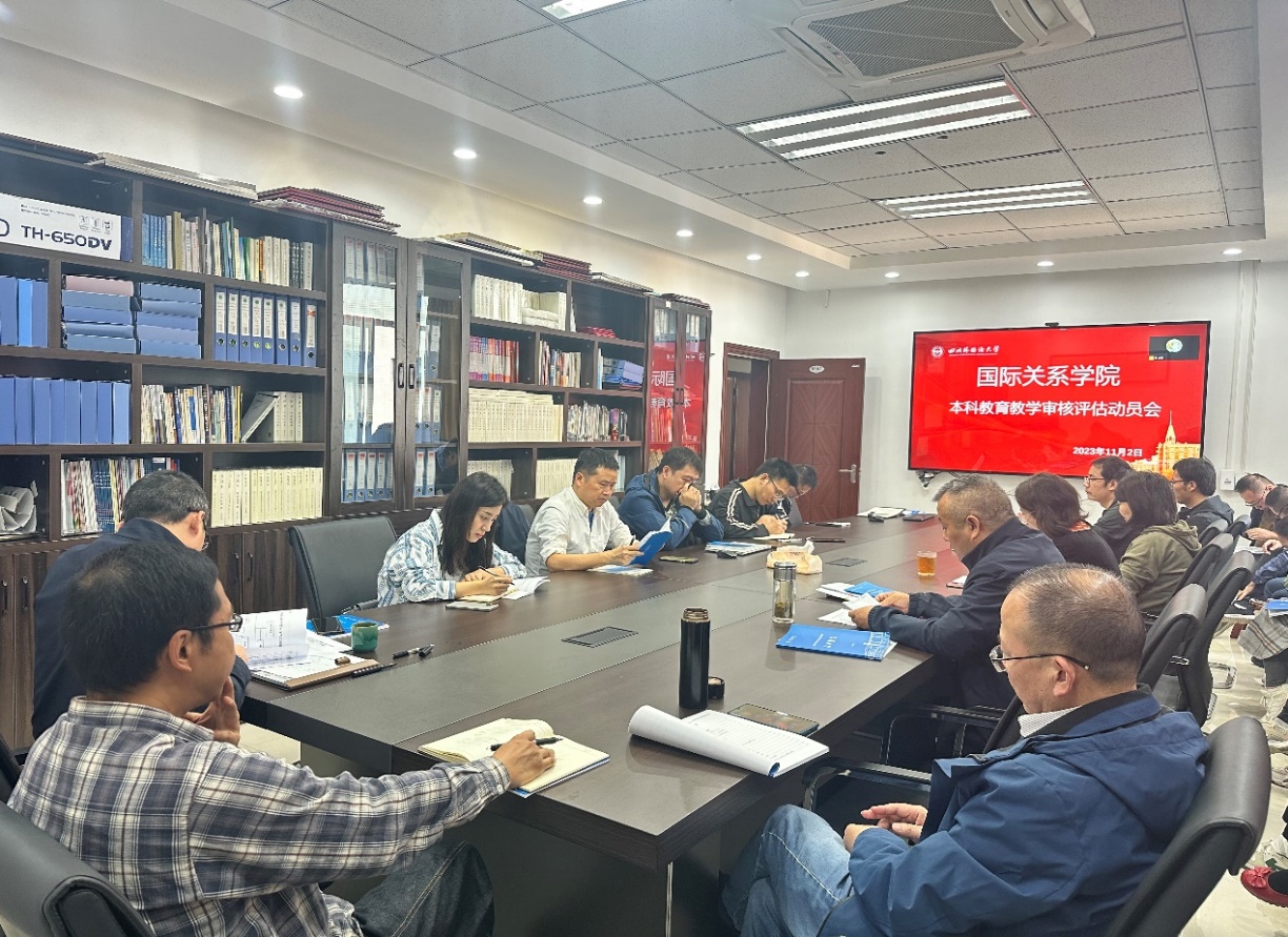 2023年11月2日中午12:30,国际关系学院在立德楼B507召开本科教育教学审核评估再宣传、动员会。党总支书记马驭骅主持会议,全体教职工参加会议。