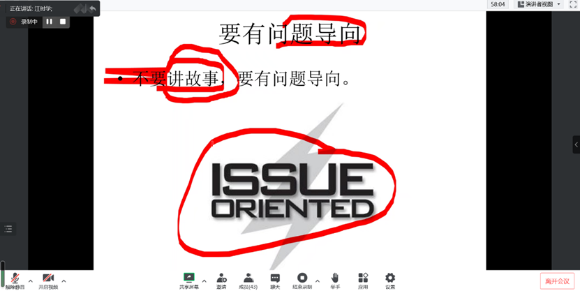 首先,江教授强调写作能力的重要性,介绍学术论文的选题技巧,将大题目与小题目比作树林与树木的关系,题目的选择主要取决于作者的能力和研究的条件。其次,从选题的政治考虑、内容的两张皮、标题的撰写、结构的安排、语言的修辞、注解的规范等角度讨论学术论文写作中容易出错的关键点,提出学术论文写作一定要有问题导向,需要回答“为什么”“怎么回事”“结果怎么样”三个问题。再次,指出评论文章讲究时效性、字数少,不需要罗列参考文献和注释,不需要理论分析,不必使用模型和数学公示等特点,评论文章观点要鲜明和善于发现“切入点”。最后,提出通过多看多写来提高文字水平,以“能力+态度+勤奋”的途径强化写作能力。在本次讲座中,江时学教授通过和师生的互动交流分享了学术论文、评论文章写作中的专业性和规范性经验,并期待3月份能与大家进行线下见面交流。