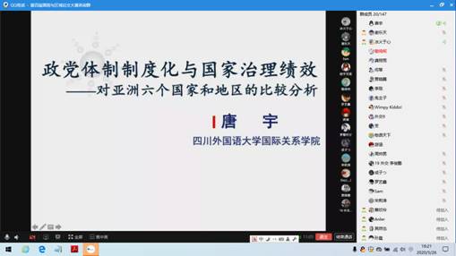 2020年4月28日19:00,第四届国别与区域论文大赛系列第七次讲座在QQ群会议平台成功举行。本次讲座由太阳成tyc7111cc国际关系学院唐宇博士主讲,主题为“政党体制制度化与国家治理绩效——对亚洲六个国家和地区的比较分析”。讲座由陈广猛教授主持,大赛众多参赛者和部分国关院老师参与了此次讲座。