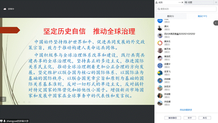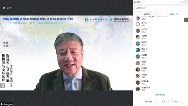 2022年11月23日,外交部国际司大使、联合国人权理事会咨询委员会委员张越大使为国际关系学院师生做了一场题为《积极参与全球治理,促进公正共赢发展》的线上精彩讲座。讲座由国际关系学院副院长吴兵主持,学院教师、全体国际组织人才实验班同学、研究生和其他感兴趣的100余位同学参加了讲座。