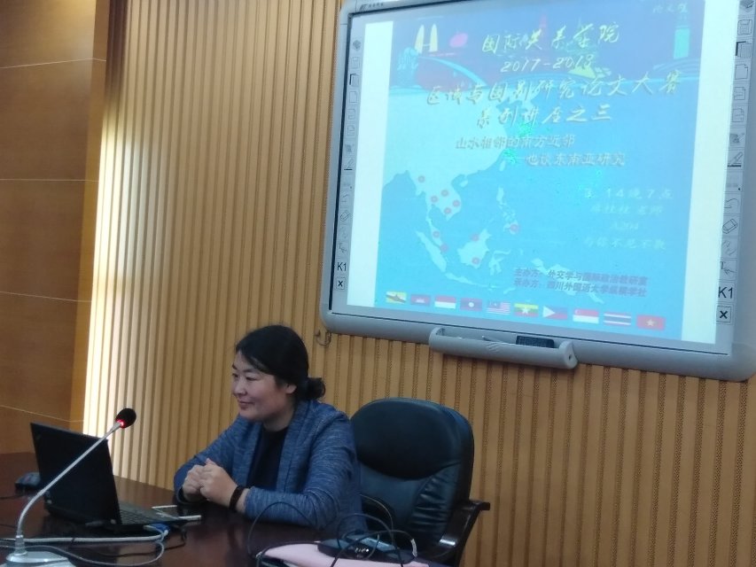 2018年3月14日晚7:00点在西区教学楼A204会议室,国际关系学院成功举行了2017-2018年度区域与国别研究论文大赛系列讲座的第三场:山水相邻的南方近邻——也谈东南亚研究。此次讲座由外交学与国际政治教研室主办,纵横学社承办,主讲老师为席桂桂副教授,前来参加讲座的有陈广猛老师、纵横学社的成员以及全校对东南亚地区研究感兴趣的同学。