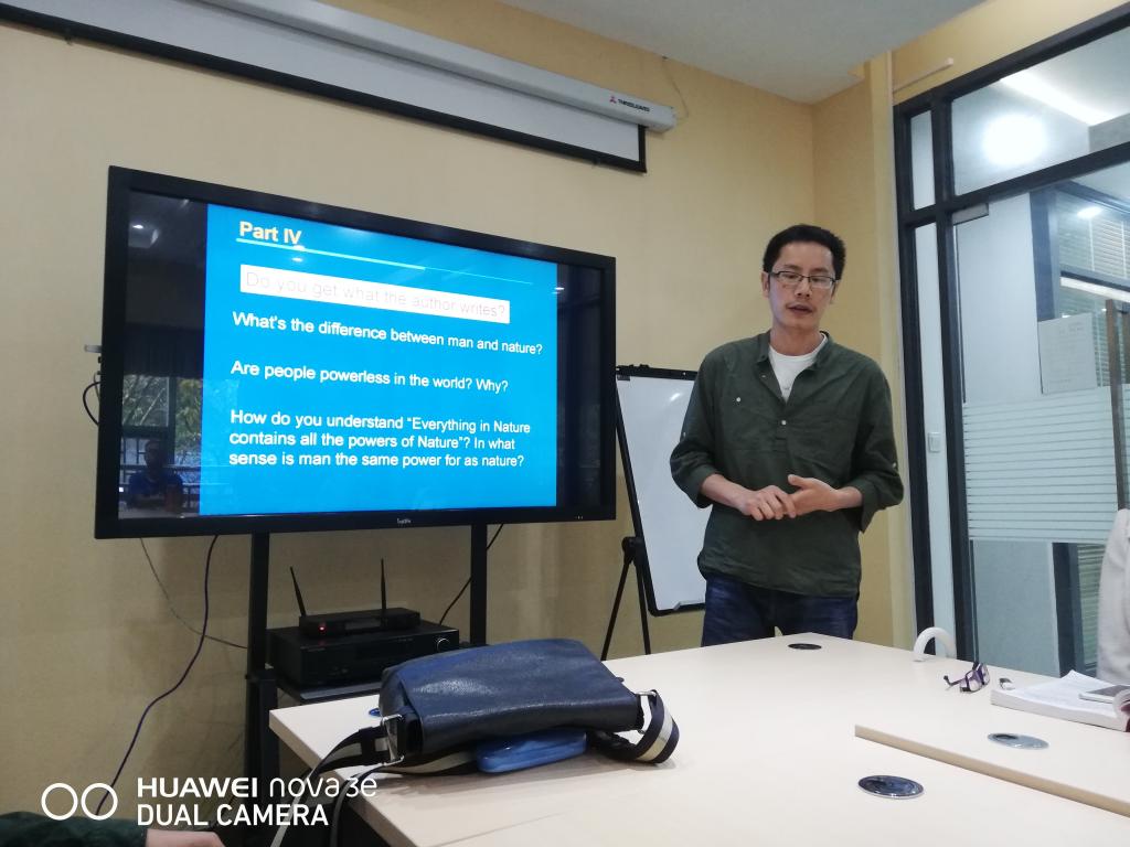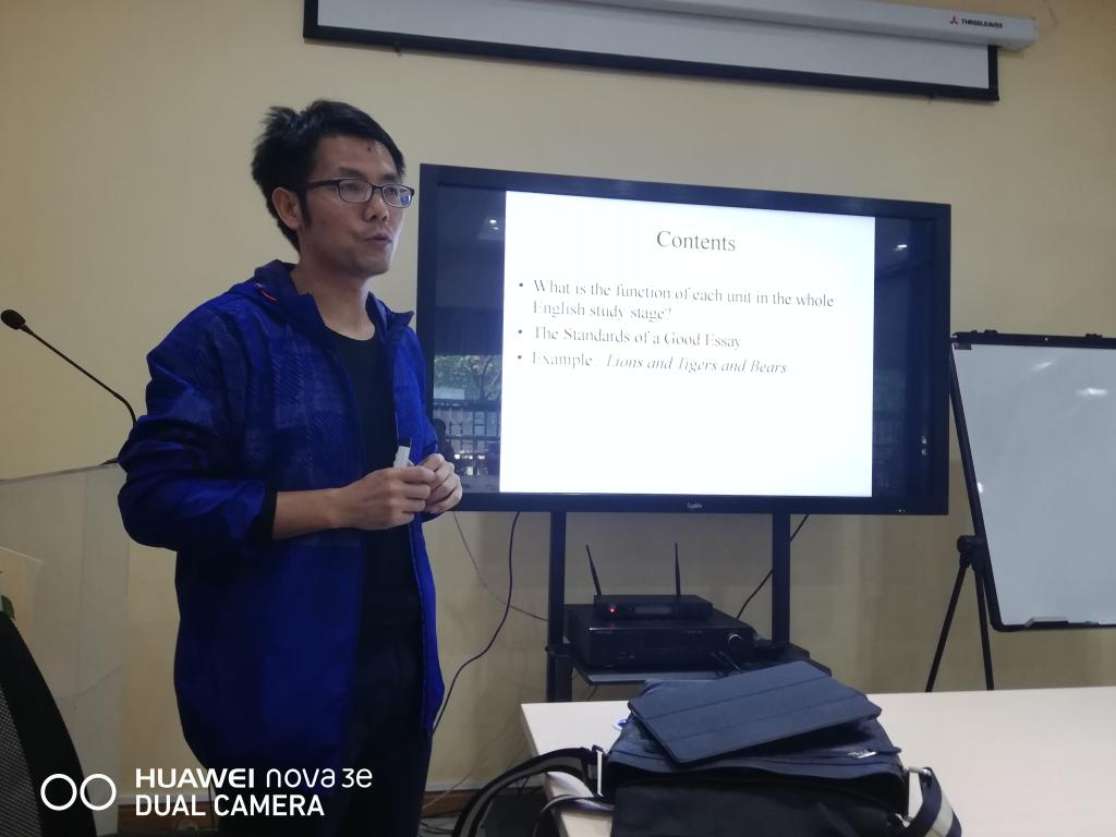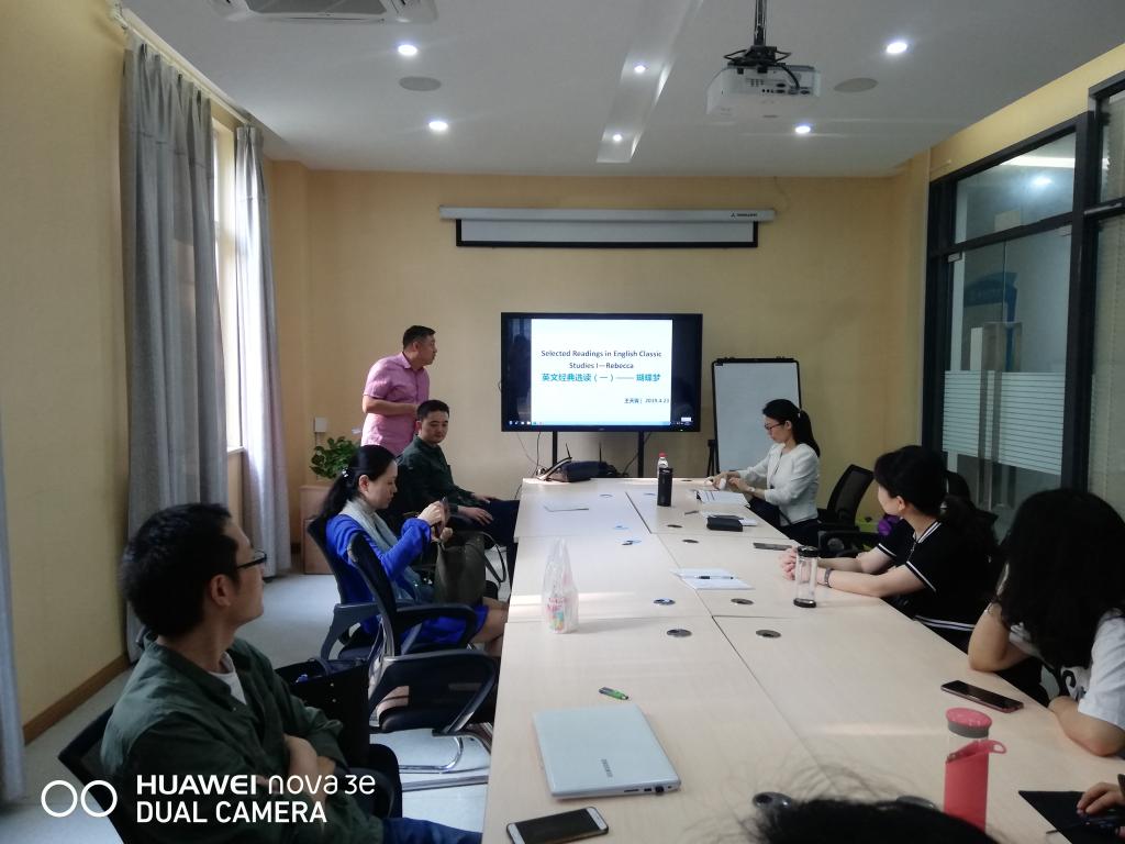 王天翼老师代表《英文经典选读》课程组,以Rebecca 为例,从故事情节和人物思维导图到导入问题的讨论,详细的介绍了授课流程。王德义老师代表《时政类报刊选读》课程介绍了在外刊The Economist 阅读中学生遇到的单词多,任务量大的问题并针对性的给出应对方法,积极进行师生共导读活动,效果较好。孟利君老师代表《基础英语》(一)课程组以what the author writes 和 how the authorwrites 为主导,从主题到语言,从宏观到微观,引导学生对文章进行深度赏析。邬德平老师(外聘)和李盛茂老师代表《基础英语》(二)发言。邬德平老师结合自己所学专业,从英汉词汇中的相似性出发,教会学生如何生动形象记忆单词。李盛茂老师通过分析文体travel essay特征,尝试了耳目一新的文本文体解读。由于人员较多,读写课程组在程玲老师的带领下在另一个活动场地开展了课程交流活动。