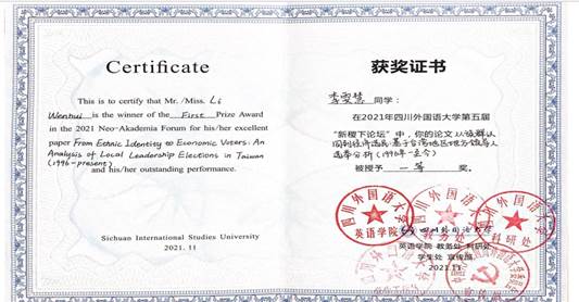 最终,国际关系学院同学共获得1个一等奖(总共3个一等奖),2个二等奖(总共6个二等奖),2个三等奖和3个优秀奖。其中由李雯慧、全薏霖、潘若浅三位同学合写的论文《从族群认同到经济选民:基于台湾地区地方领导人选举分析(1996年-至今)》获得一等奖,全薏霖同学撰写的论文《新功能主义“外溢”理论失灵在拉美一体化进程缓慢中的展现及对策》和熊振同学撰写的论文《2021巴以冲突后以色列对阿外交的新动向》获得二等奖,敬明柯同学撰写的论文《土耳其媒体所呈现的中国国家形象研究——以阿纳多卢通讯社报道 (2020-2021)为例》和角红媛同学撰写的论文《中日双边关系——基于“事件数据分析法”的视角》获得了三等奖,蒋欣洛同学撰写的论文《“乌曼朝圣”事件及其对乌克兰-以色列两国关系的影响研究》、吕佳育同学撰写的论文《“美国圈子”背后的“大战略”》和严烨同学撰写的论文《探析中国石油外交互动因素——基于美国撤军阿富汗事件》获得了优秀奖。