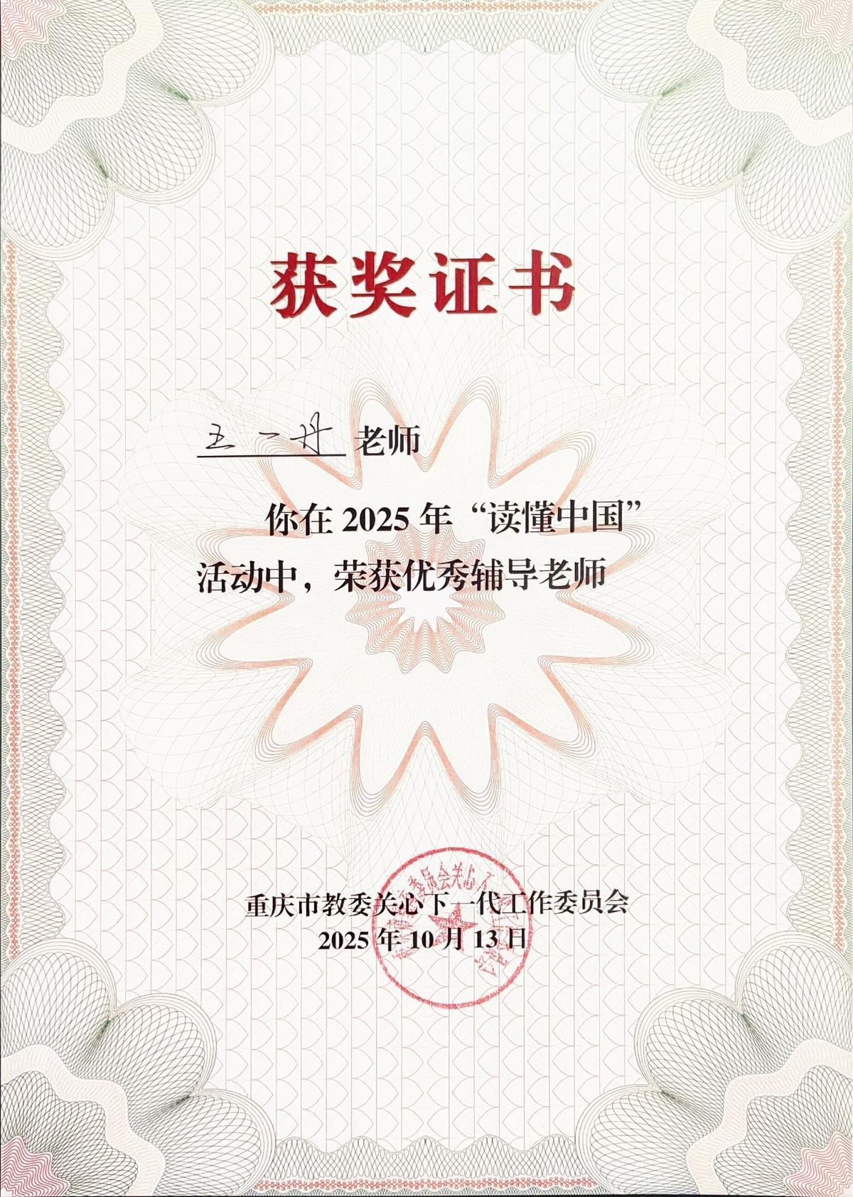 近日,重庆市教委关心下一代工作委员会公布了2025年“读懂中国”活动获奖作品名单。在学校关工委的悉心指导与学院的大力支持下,国际关系学院学子积极参与并斩获佳绩。高博之同学的征文作品《一棵树,摇动另一棵树——记康清莲教授的师者之路》荣获2025年“读懂中国”活动征文三等奖,王一丹老师荣获优秀辅导老师奖。