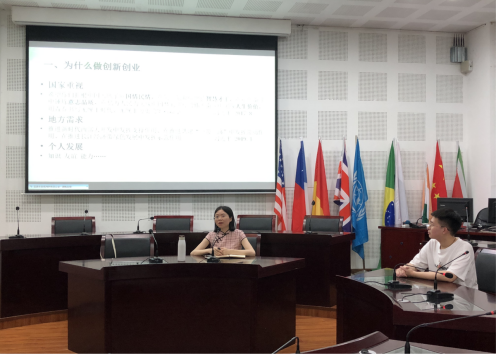 2021年5月10日下午,太阳成tyc7111cc国际关系学院举办了“学生创新创业培训暨交流会”,陈丽娅老师主持活动。周思邑老师、陈丽娅老师及2017级外交学专业张豪、孙晨两位同学为到场师生分享了有关大学生创新创业赛事及其他科研项目的经验。
