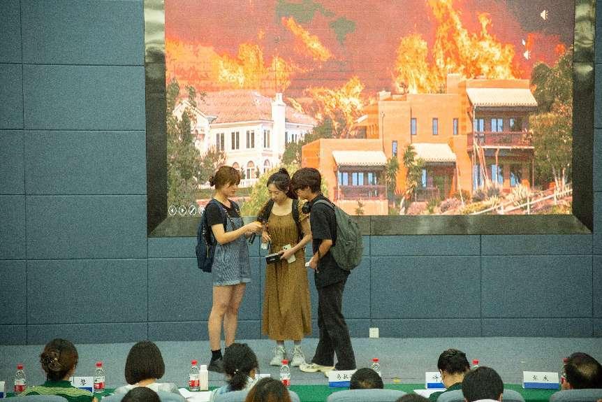 第一个节目是由国际关系学院2022级池端晗等同学带来的作品《烈焰中的庇护》。以色列多地发生火灾,海法大学和海法理工大学的留学人员受困。中国驻以色列使馆立即启动I级应急处置机制,迅速组建救援应急指挥小组,安抚学生情绪,组织留学人员紧急撤离。在中国公民需要的时候,大使馆就在身边,祖国庇护中国公民回家。