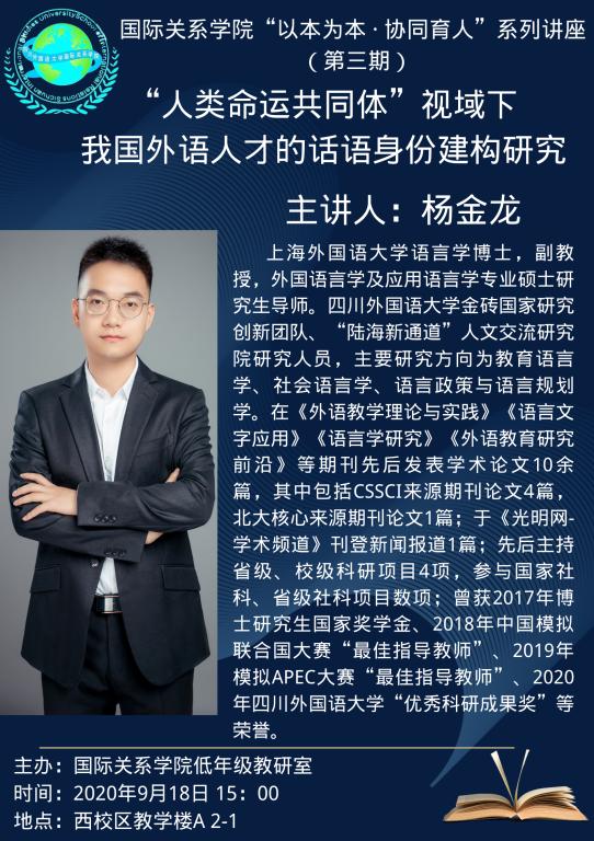 2020年9月18日下午,由国际关系学院低年级教研室主办的国际关系学院“以本为本协同育人”系列讲座(第3期)如期在西区A2-1实验室举行。李金树副院长和全体低年级教研室教师参加了此次活动。