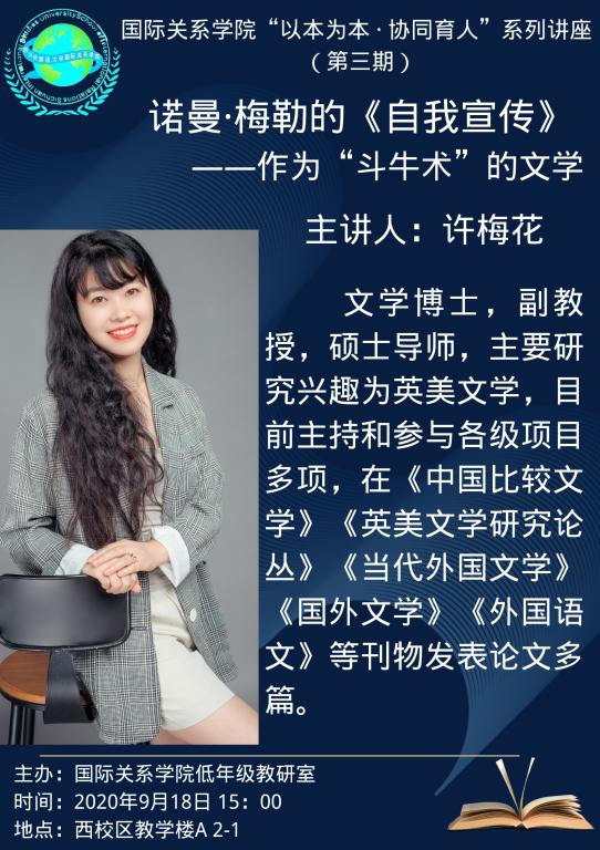 本次讲座的主讲嘉宾有许梅花博士和杨金龙博士。二位分享了各自研究领域的成果和心得。许梅花博士讲座的主题是“诺曼梅勒的《自我宣传》-------作为“斗牛术”的文学”。许博士从斗牛文学的三个层面:危险层面、规则层面和审美层面剖析了《自我宣传》其实就是诺曼梅勒的个人自传。写作是一种血腥的体育运动,写作行为就是一场斗牛活动。杨金龙博士讲座的主题是“‘人类命运共同体’视域下我国外语人才的话语身份和建构研究”。杨博士认为话语实践与身份之间的动态建构关系成为语言学领域的研究焦点。外语人才作为语言与文化的传播者,基于“解放语用学”的英语输入理论,在教材建设上应该深化教材的本土人文性。