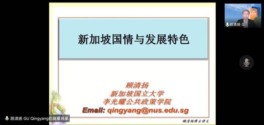 为推进研究生课程建设和区域国别学交叉学科建设,2022年4月21日晚,《国别与区域研究导论》研究生课程组邀请重庆巴渝学者讲座教授顾清扬在线与我院师生进行学术交流。顾教授此次嵌入式教学和学术交流由学校人事处副处长谌华侨老师主持,主题为《新加坡国情与发展特色》,院内四十余名师生参加本次云端交流。
