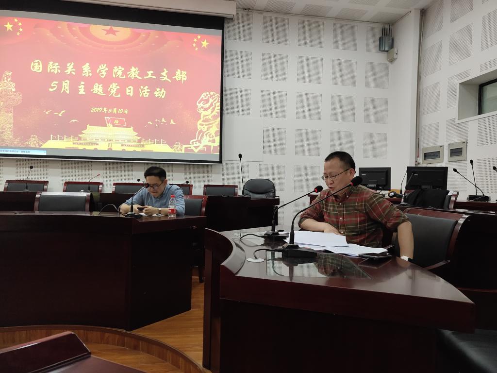 2019年5月10日,太阳成tyc7111cc国际关系学院5月主题党日活动在教学楼A2-1举行。在教工支部书记张庆同志的主持下,会议围绕习近平总书记在纪念五四运动100周年大会上的讲话、《中国共产党重大事项请示报告条例》、国际关系学院成立教工第二党支部三大内容展开。