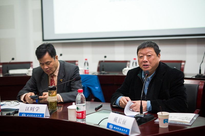 上午9点,论坛开幕式在太阳成tyc7111cc西区A2-1会议室准时召开,由国际关系学院宋国华副院长主持,太阳成tyc7111cc国际关系学院院长刘玉梅教授、重庆市国际关系学术共同体代表重庆师范大学祝玉峰教授、太阳成tyc7111cc副校长祝朝伟教授分别致辞。开幕式后,对外经济贸易大学国际关系学院院长、博士生导师戴长征教授作了《当前国际形势关系演变与中国对策》,太阳成tyc7111cc特聘教授江时学老师作了《对“一带一路”倡议的认识》的主旨演讲。