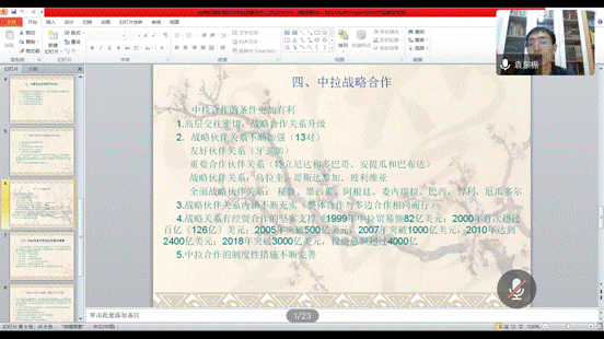 讲座之初,张庆博士首先向大家简单介绍了袁东振教授及其相关研究的领域和贡献,并代表在线师生对袁教授应邀参加讲座表示热烈的欢迎和衷心的感谢。接下来,袁教授从拉美的基本情况出发,介绍了本次讲座主题的背景,包括拉丁美洲的概念、国家情况、人口和特性。然后,再从拉美国家的实力、潜力、国际话语权、自主空间和国际影响力的角度论述了拉美在世界格局中的地位。其次,从拉美在中国对外战略格局中的地位出发,阐述了中拉战略合作的基本情况和中拉关系中存在的问题和障碍,并进一步阐释了相关原因、提出了解决障碍和提高合作水平的方法。最后,袁教授还认真详细地回答了同学们提出的问题,为同学们提供了新的思考路径。整场讲座严谨且有趣,师生们进行了热烈的互动交流。