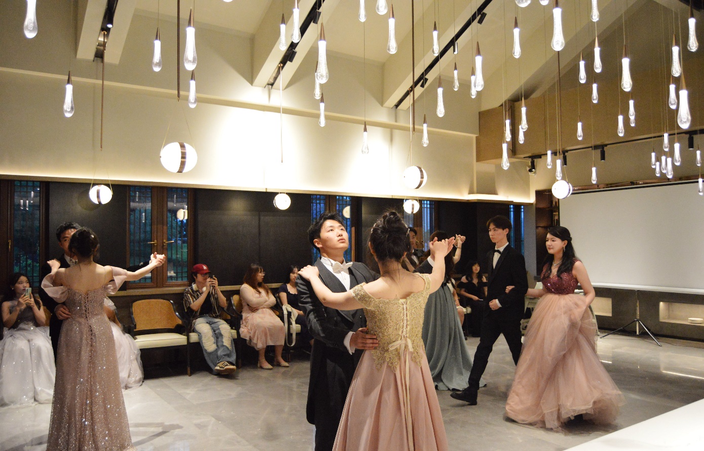 随后,钟理、王延涛两位同学带来了开场舞。之后,同学们携舞伴共舞华尔兹,开展自由舞环节。接下来多个精彩节目轮番上演,胡泽慧同学表演的《Price Tag》、刘宇航同学演唱的《September》、余函悦和王澜洁同学带来的《世界上另一个我》以及胡婷婷同学的葫芦丝独奏,将舞会气氛推向了高潮。