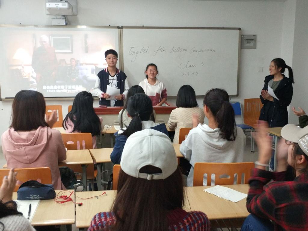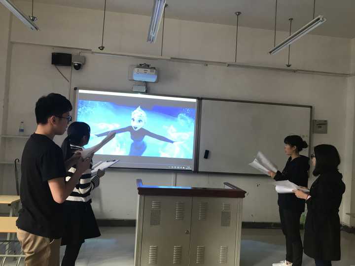 选手们的表演结束后,各班指导老师对各组选手的表演依次进行点评,指导老师在点评时不仅注意同学们的英语发音是否标准,吐词是否清晰,还注重同学们对所配音角色的情感还原、情绪表达以及英文腔调与中文腔调的不同,同学们在表演时语调的变化。点评过后并对各组同学的表演进行打分。同学们也认真倾听指导老师的点评及建议,并做好笔记,记下自己的表演问题与发音错误,以便进行课后改正。
