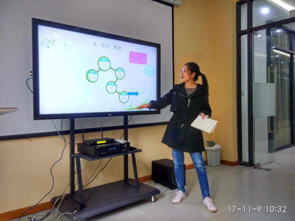 本次活动共有四位老师进行了教学经验分享。王天翼老师分享了词汇教学中的思维导图的重要作用。通过讲故事的形式进行形象记忆。邓帮华老师分享了语法课程的教学设计,分主题,提倡课程互补。黄慧老师分享了PBL模式在英语专业语法课堂的实践情况。强调主动学习和合作学习的重要性。杨红老师分享了读写课程中的授课经验,结合国关特色,多补充最新时政类的新闻,对热点话题进行素材积累和框架帮助。