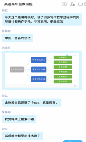 高年级教研室老师在听讲座的同时也进行了线上交流,分享自己的心得体会,都表示获益匪浅,对教学中的技术应用和学术写作课程中的问题进行了积极探讨。老师们认为讲座内容突破了某些学习瓶颈,并充分利用线上教学平台和技术手段,强化了师生互动和生生互动,非常值得借鉴。两场讲座也激发了大家对于教育技术的学习热情。