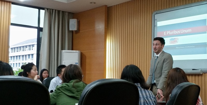 2018年4月26日晚上7:00在西区教学楼A204会议室,国际关系学院成功举行了2017-2018年度区域与国别研究论文大赛系列讲座的第五场美国研究专场。此次讲座由陈广猛老师主持,外教Christopher Crachiola(Chris)主讲,前来参加讲座的有谌华侨老师、李海英老师、姚兰老师、葛静静老师,纵横学社的成员以及全校对美国研究感兴趣的同学。