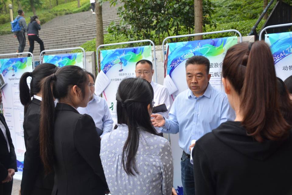 活动开始后,现场便不时有学生被作品吸引而来。穿着整齐的学生工作人员为观众细心讲解作品内容。上午十时左右,明国辉书记等领导前来参观活动。黄慧老师及工作人员对作品依次进行了详解并热情解答现场领导提出的问题。刘玉梅副院长就国关院课程思政工作做了简单交流汇报。经过一番交流,领导、老师和学生都大有收获。参观了作品后,领导们一致认为开展此次活动对于学校推进“课程思政”改革和培养复合型人才具有积极意义,有助于提升学生的思辨能力和促进学生与国际接轨。领导老师们也各自发表了对活动的独特看法。严功军处长分别从宏观、中观和微观三个层面讨论了此次活动的意义,表达了对此次活动的支持以及对于院系间合作更好开展此类活动的期望。明国辉书记表示赞同并以两个“目的”概括此次活动意图,肯定了此次活动对于学生在“德育”和“智育”方面的促进作用以及学生科研能力在此过程中的锻炼。明国辉书记最后鼓励学生们以后深度挖掘出更多值得探索的事件。此次活动在大家留影后顺利进入尾声。