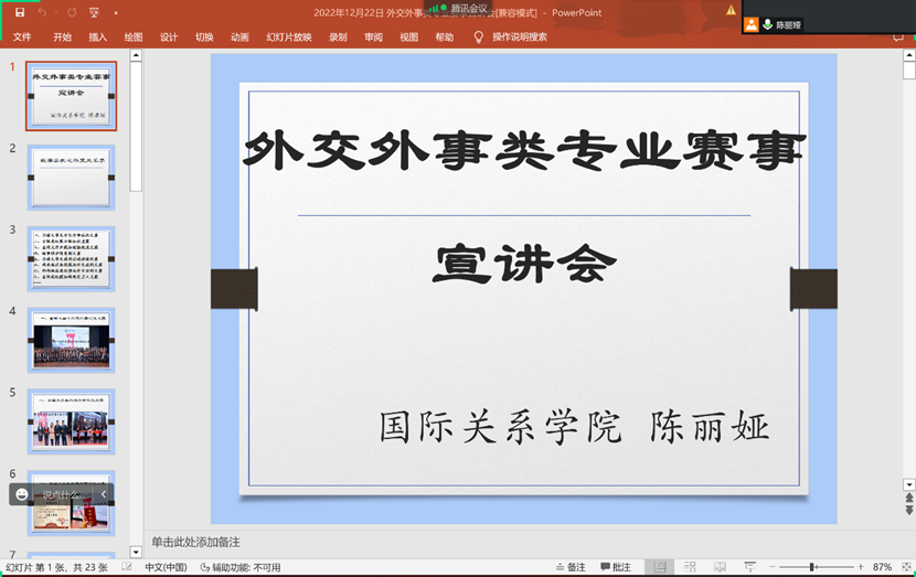 2022年12月22日上午10:00在腾讯会议平台国际关系学院2022级全体同学参加了本学期劳动实践周的重要活动——“外交外事类专业赛事及‘祖国在我身后’领事保护情景剧大赛宣讲会”。国际关系学院陈丽娅老师、2020级国际组织人才实验班桂琪同学和2021级国际组织人才实验班侯雪睿同学分别做了介绍和分享。