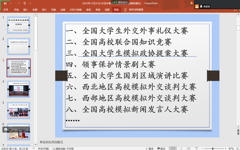 首先,陈丽娅老师为同学们介绍了外交外事类专业赛事的具体情况,包括:全国大学生外交外事礼仪大赛、全国高校联合国知识竞赛、全国大学生模拟政协提案大赛、领事保护情景剧大赛、全国大学生国别区域演讲大赛、西北地区高校模拟外交谈判大赛、西部地区高校模拟外交谈判大赛和全国高校模拟新闻发言人大赛,详细讲述了川外的参赛历程并展示了比赛照片和取得的成绩。陈老师鼓励同学们积极参与到丰富多彩的赛事活动中,激励大家通过赛事实践不断提升自身的专业能力和综合素养。