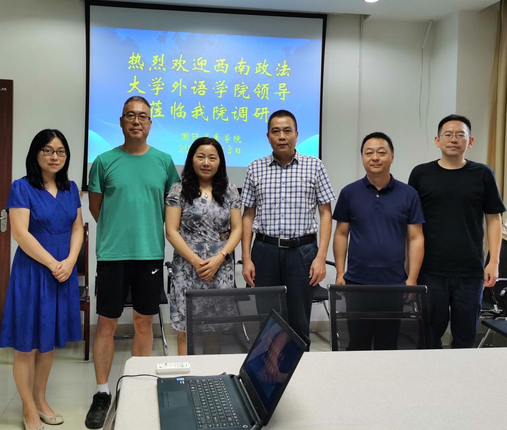 2020年9月3日下午,西南政法大学外国语学院李立宏院长、朱元庆副院长来我院调研。我院刘玉梅院长、李金树副院长、张庆助理、魏涛老师在B507与调研组进行了会谈。