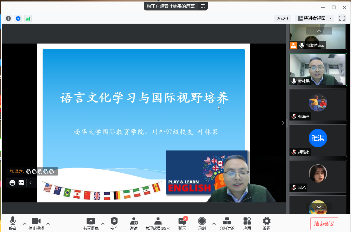 为进一步拓宽学生的国际视野,提高学生的专业素养,丰富校园文化,营造良好的语言文化学习氛围,国际关系学院“朋辈榜样、助力成长”第八期推出了“语言文化学习与国际视野培养”为主题的分享会。2021年10月18日晚上7点,西华大学国际教育学院、川外2001届校友叶林果在腾讯会议进行了这个主题的分享,学院的包淑萍老师做主持,共计100余名同学参加了此次分享会。