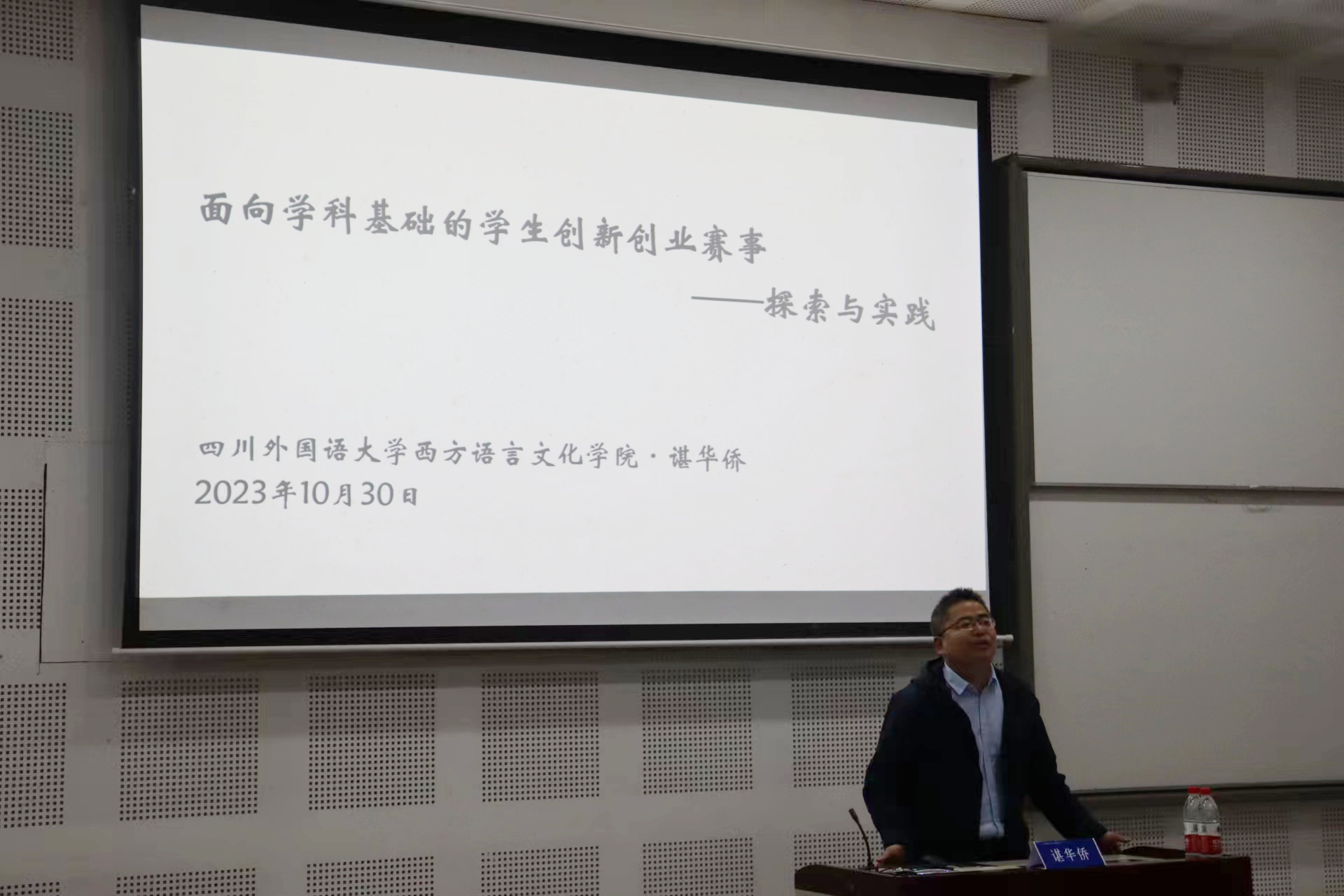 2023年10月30日上午9:30,新文科歌乐书院于学校西区歌乐楼A1-2阶梯教室举办了“创新创业赛事指导讲座”。讲座邀请到了西方语言文化学院谌华侨副院长(主持工作)为同学们进行“大创”赛事的介绍和指导,国际关系学院张国玺老师主持讲座,国关院2021、2022、2023级国组班全体同学参加了讲座。