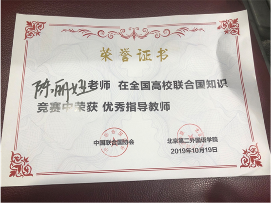 陈丽娅老师获“优秀指导教师”荣誉证书
